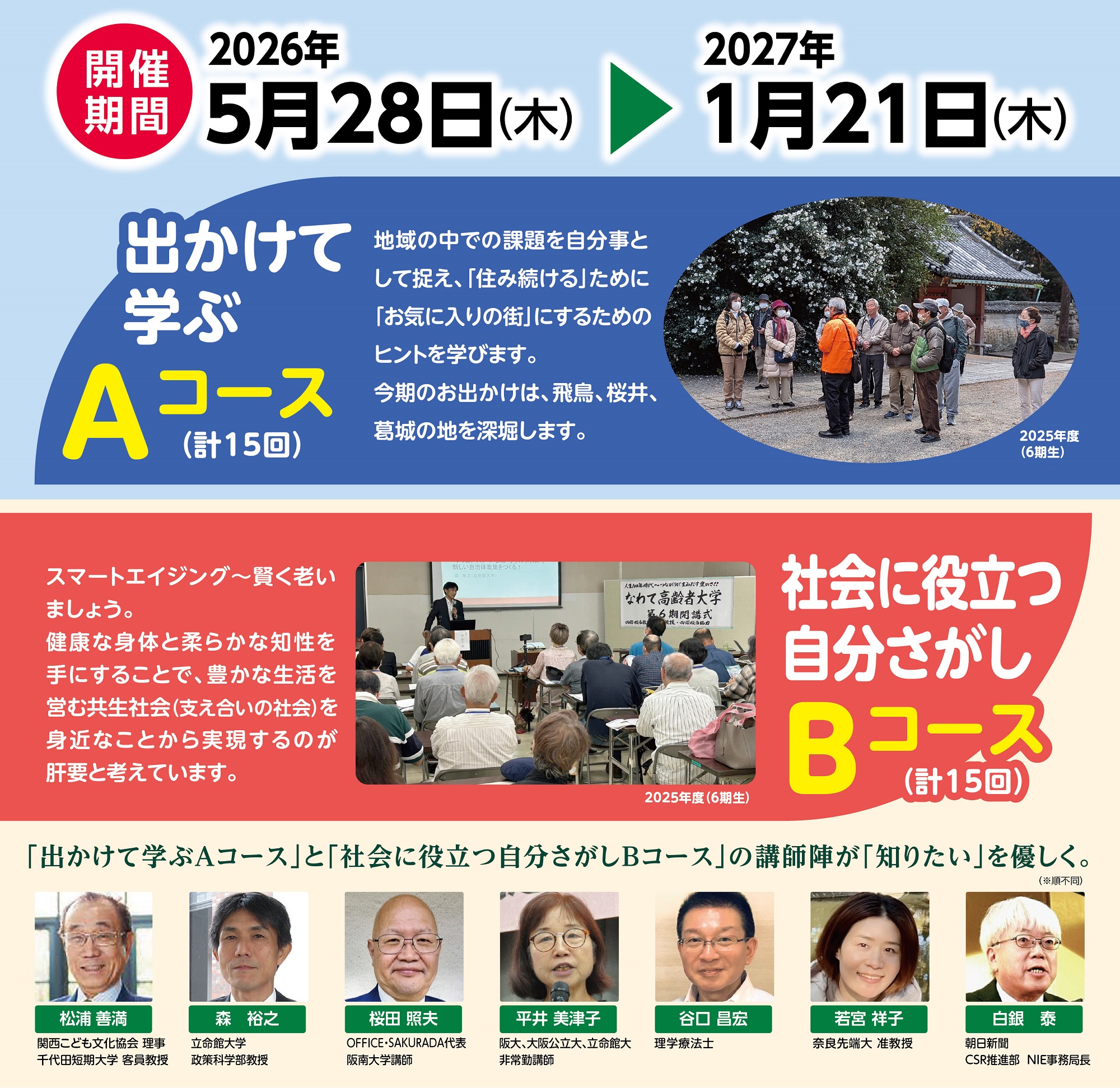 超高齢社時代に入った今、四條畷市民たちが今後の人生設計や自分が住む街などに対して不安や心配を感じていると思います。そんな中、2019年に「四條畷市公募型提案協働のまちづくり提案事業」に応募して「なわて高齢者大学」をスタートさせました。四條畷市民たちが、「これから自分で何がやってみよう」と自己啓発を重ねながら、楽しい人生設計や豊かなまちづくりなどを各現場で活躍する著名人や専門家、医療・福祉関係者と共に学び、交流を深め、スキルアップをはかることができます。これまでに1~5期生が受講され、リピーターも多くいらっしゃいます。