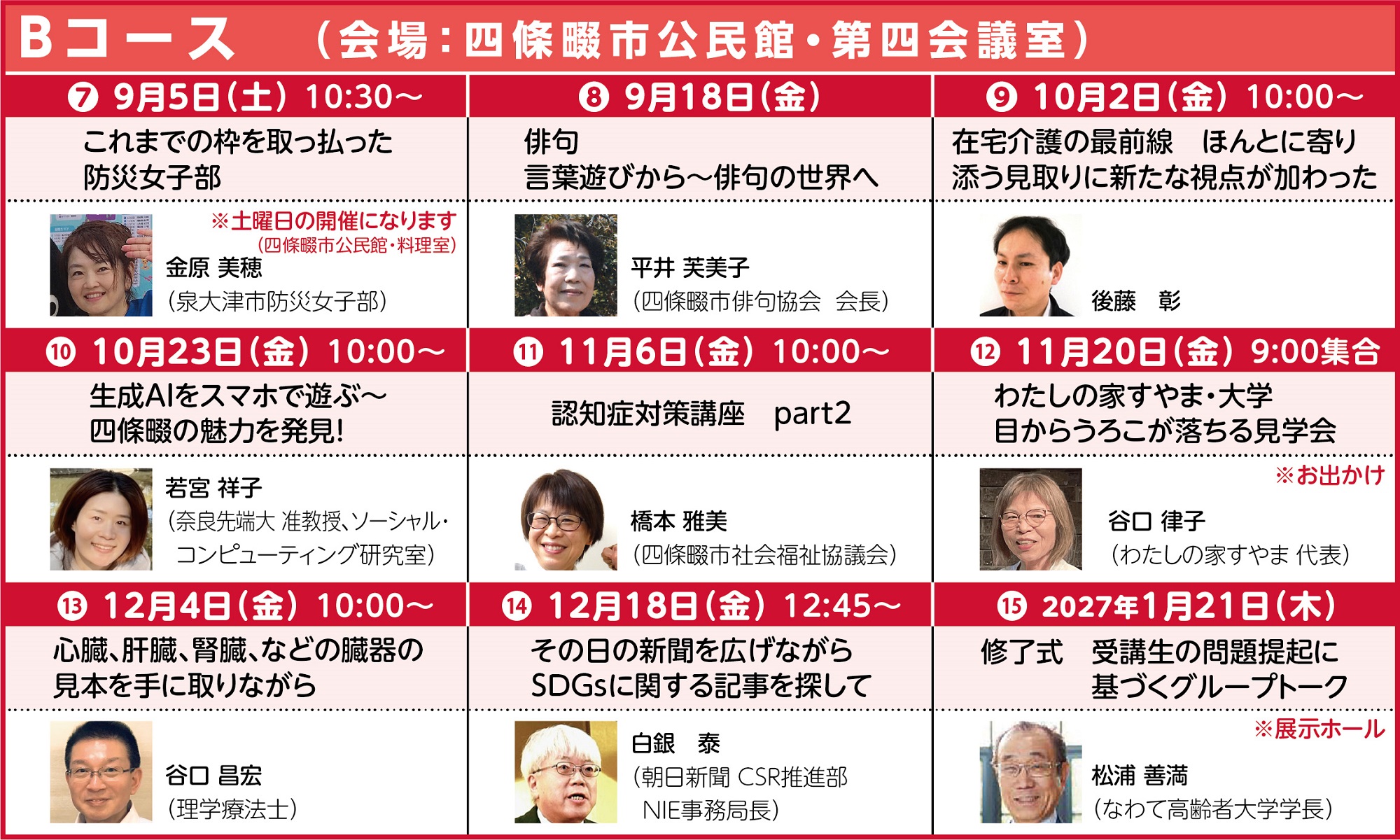 自分が住む街について学ぶ「Aコース(15回)」、助け合う共生社会を学ぶ「Bコース(15回)」がございます。 |